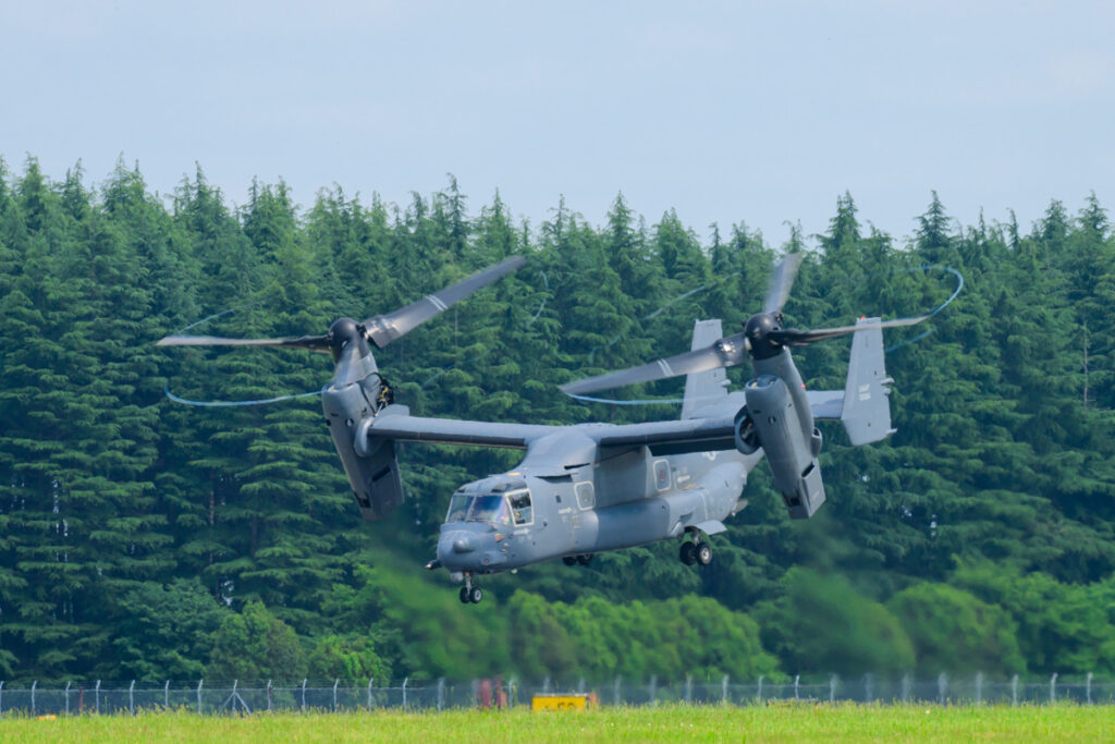 オスプレイはヘリコプターのように垂直離着陸が可能で、その後プロペラの向きを変えて飛行機の様に飛ぶことができる次世代の機体です。