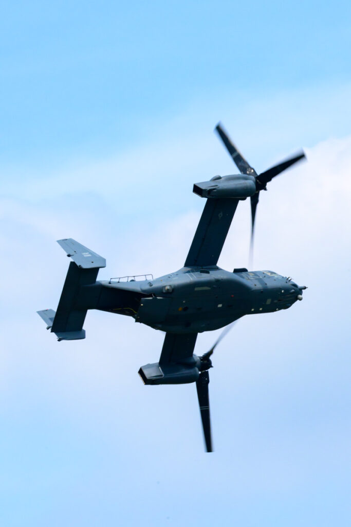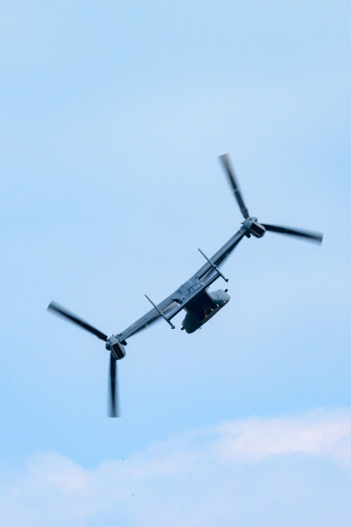 ヘリコプターやプロペラ機の撮影では、躍動感を出すためにシャッター速度を遅くしてローター(回転翼)をブラして撮影したいのですが、オスプレイはローターが大きく回転速度が遅いため、ローターがブレるようにシャッター速度を落として撮影すると手ブレや被写体ブレが発生します。