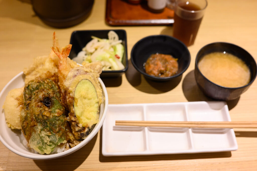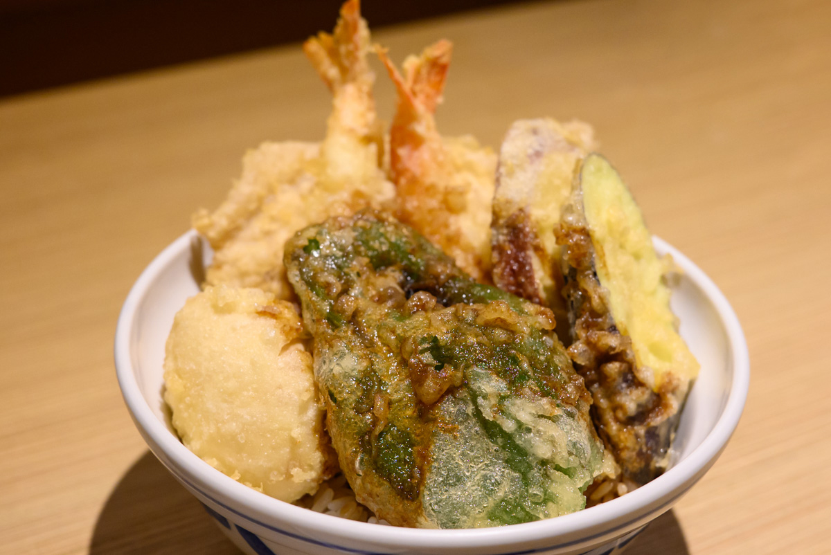 海老二尾、豚肉、茄子、ピーマン、さつまいも、玉ねぎ、卵(半熟)が乗った豪華な天丼です。